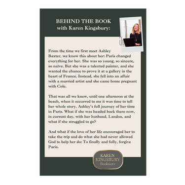 In Indiana, Ashley Baxter Blake and her husband are about to take an anniversary trip to Paris, but she is hesitant. More than two decades ago, she made her most grievous mistake in that same city. She has never forgiven herself for what happened there, and she still harbors secrets that she’s afraid will come to light. Just before the trip, Ashley gets a call from her niece. Jessie explains that her French boyfriend’s mother remembers working at a bakery with an American named Ashley. “Could that be you?”